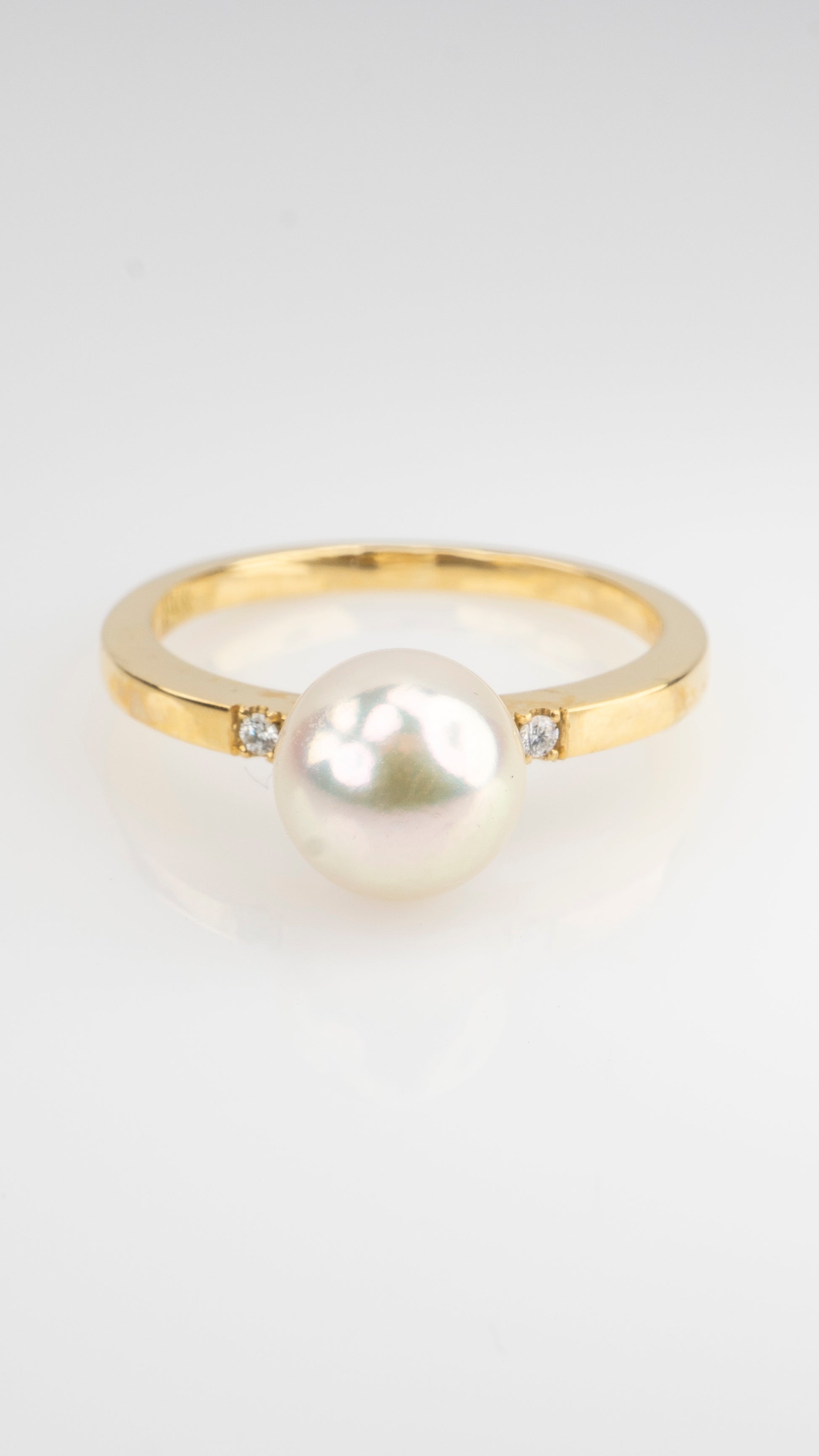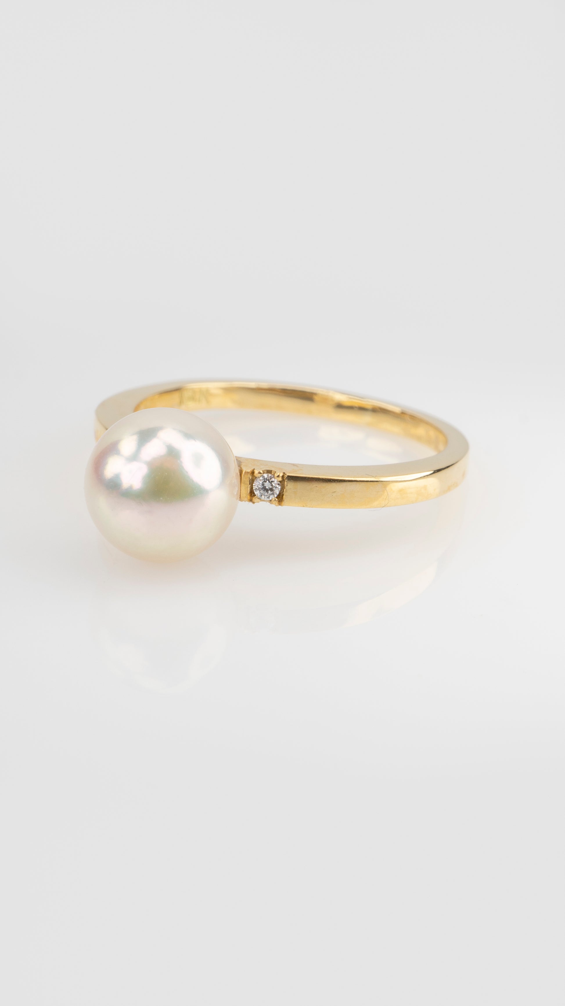 Anillo de perla engastada en oro amarillo 18k, con detalle de brillantes a loslados, un detalle super delicado y diferente.